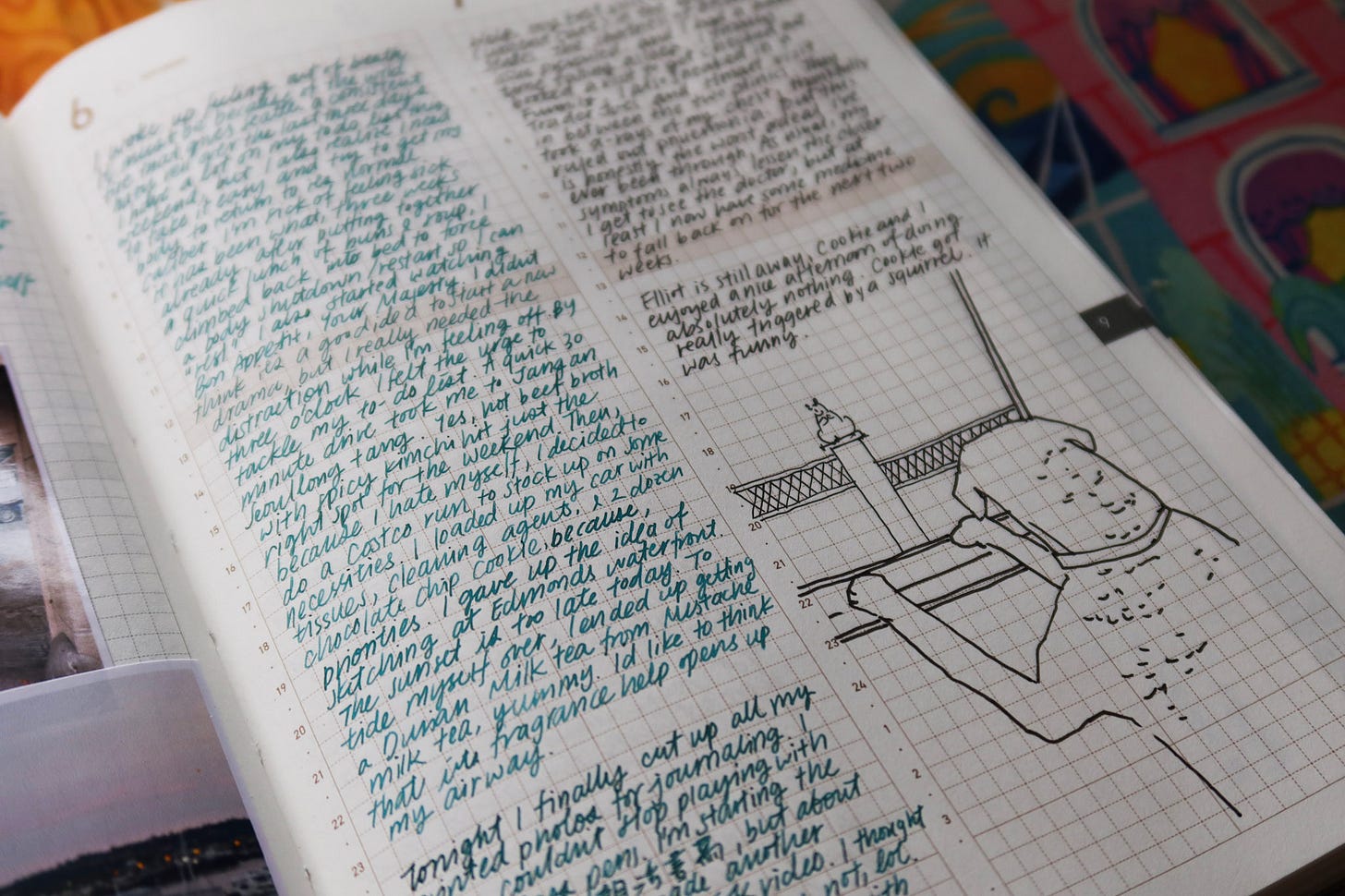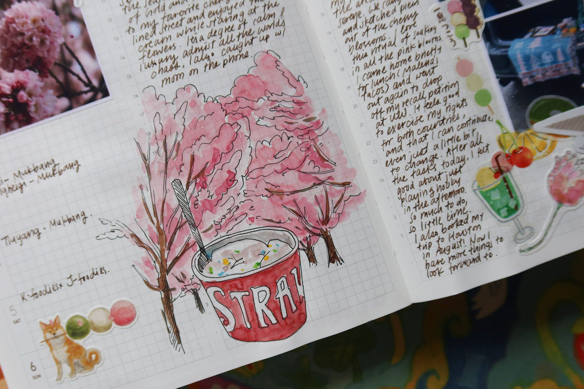I enjoy doodling about my family members (including my dog), the delicious meals I had (I love food), and sometimes I’d paint little vignettes of the scenes outside my window. In my opinion, there’s no “boring life” nor details “not significant enough” in our everyday. I’d sometimes note down the pattern of crows that flew into the air on a rowdy afternoon. I’d write about the color changing in the canal, reflected by the sunset. I love how the creative journaling habit made me a keen observer of life. Instead of living through the blur of time, I enjoy being mindful and present in every moment.