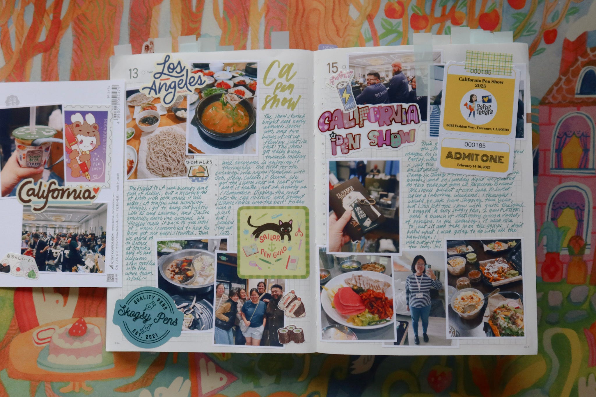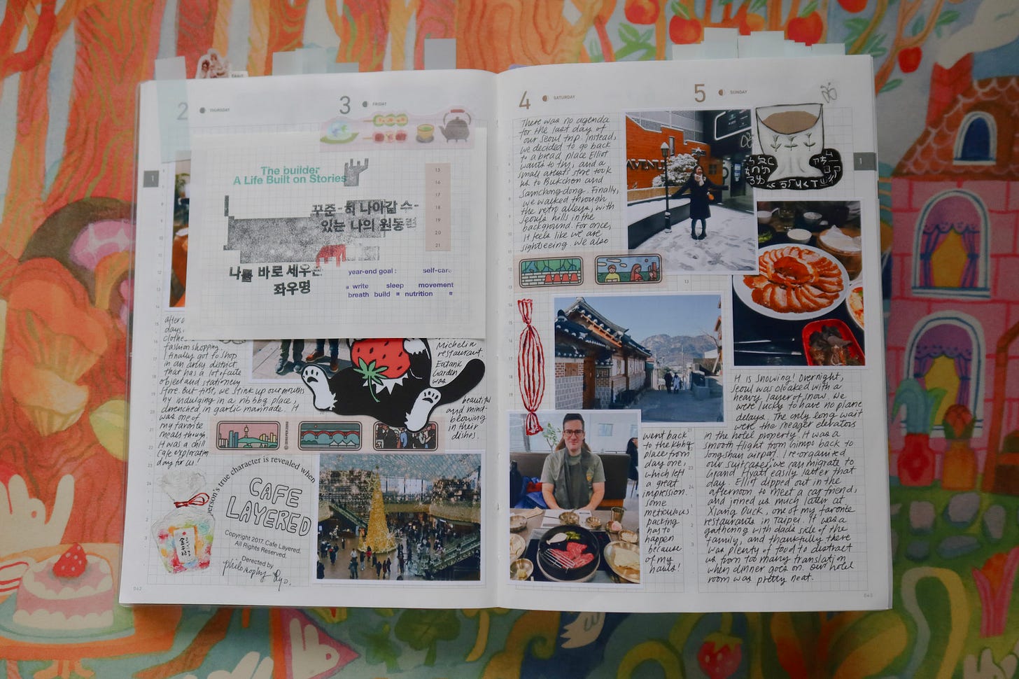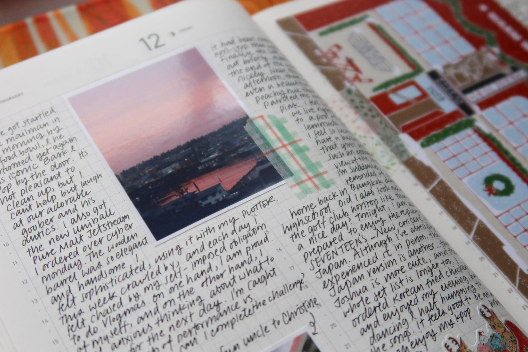 When I’m on the road traveling, I don’t carry this brick of a journal with me, and instead, I “catch up” at a later time and turn those days into a fun travel scrapbooking entry. I would print out photos from my phone and create collages on the page. The strong binding of the journal also allows me to tip in postcards, scrap paper, and ephemera that I collect on trips. Whenever I write about a trip, I feel giddy as if I’ve experienced the journey all over again.