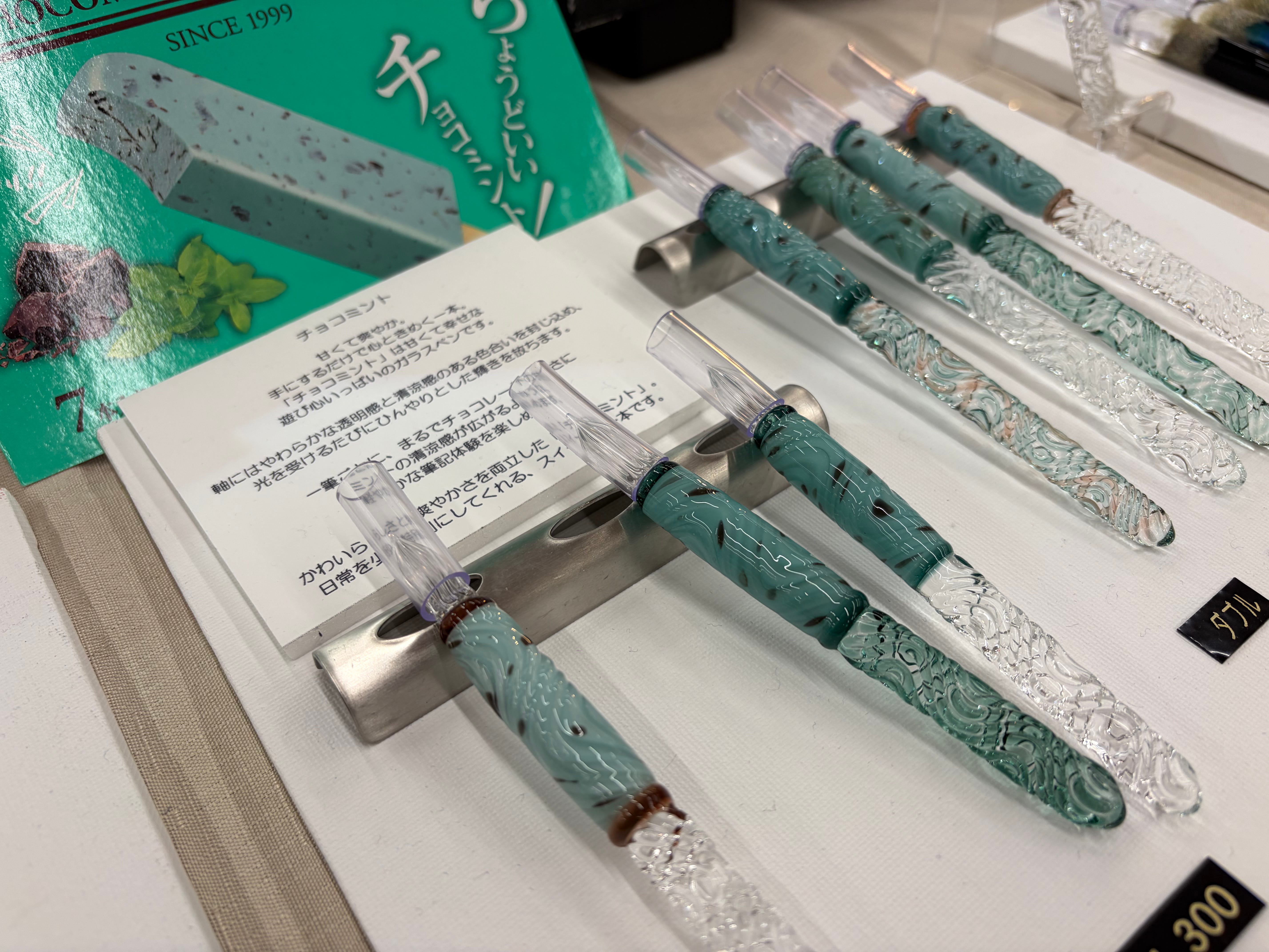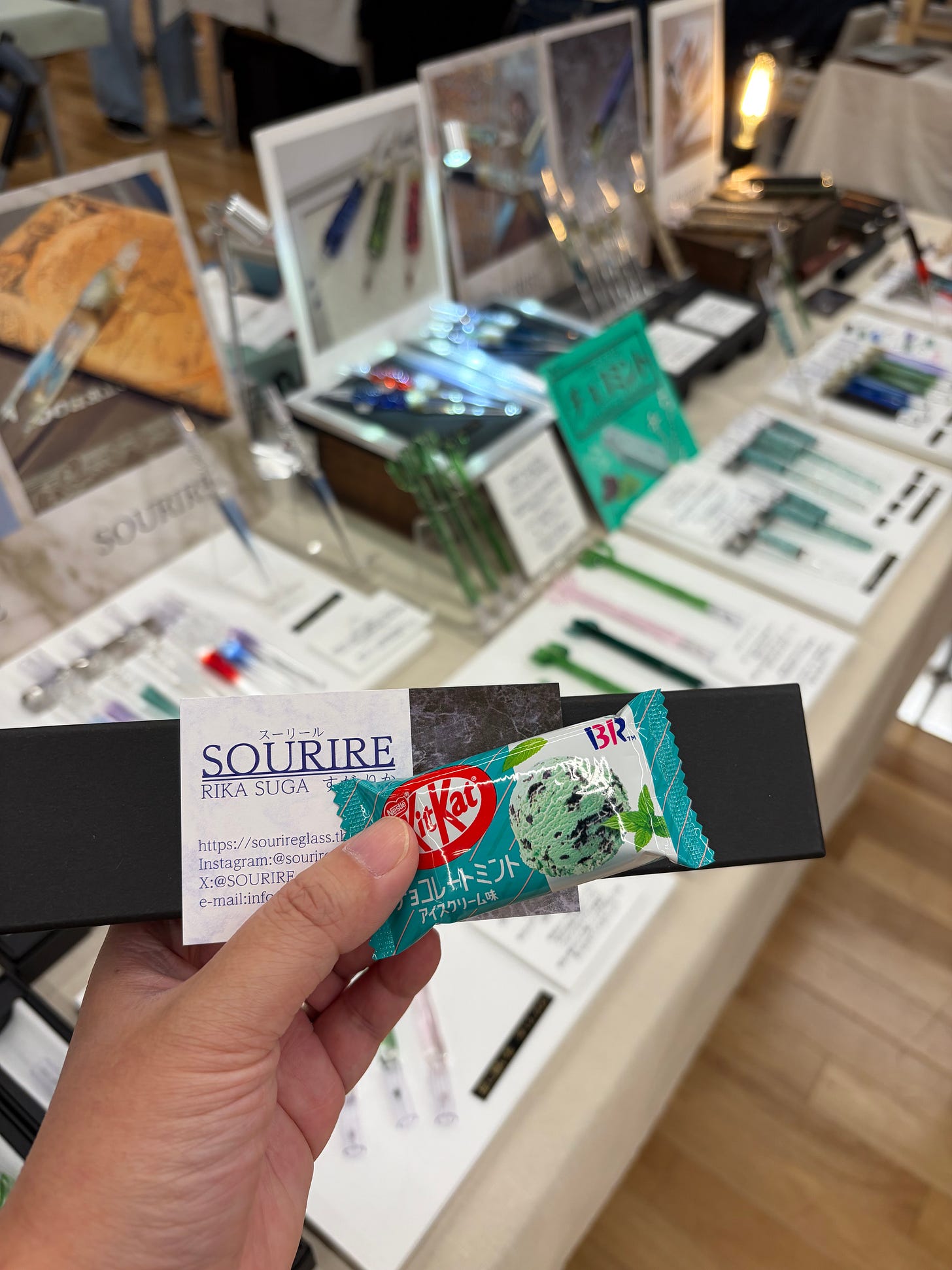 Sourire glass pens are made by the glass artist Rika Suga. They are delicately made with a variety of designs and styles. For TIPS, she made a little collection of “choco mint” glass pens. These are slim and come in normal and pocket size lengths, with the swirly texture featuring chocolate chip-dotted mint ice cream. She even offered a little dipping station to allow you to test out the nib, and it writes beautifully. I picked out a mint chocolate chip glass pen in the “Baby size”, which has a chocolate and mint swirl throughout the clear pen body. In addition to the packaged box, she also gifted me a little mint-chocolate Kit Kat, how cute!
