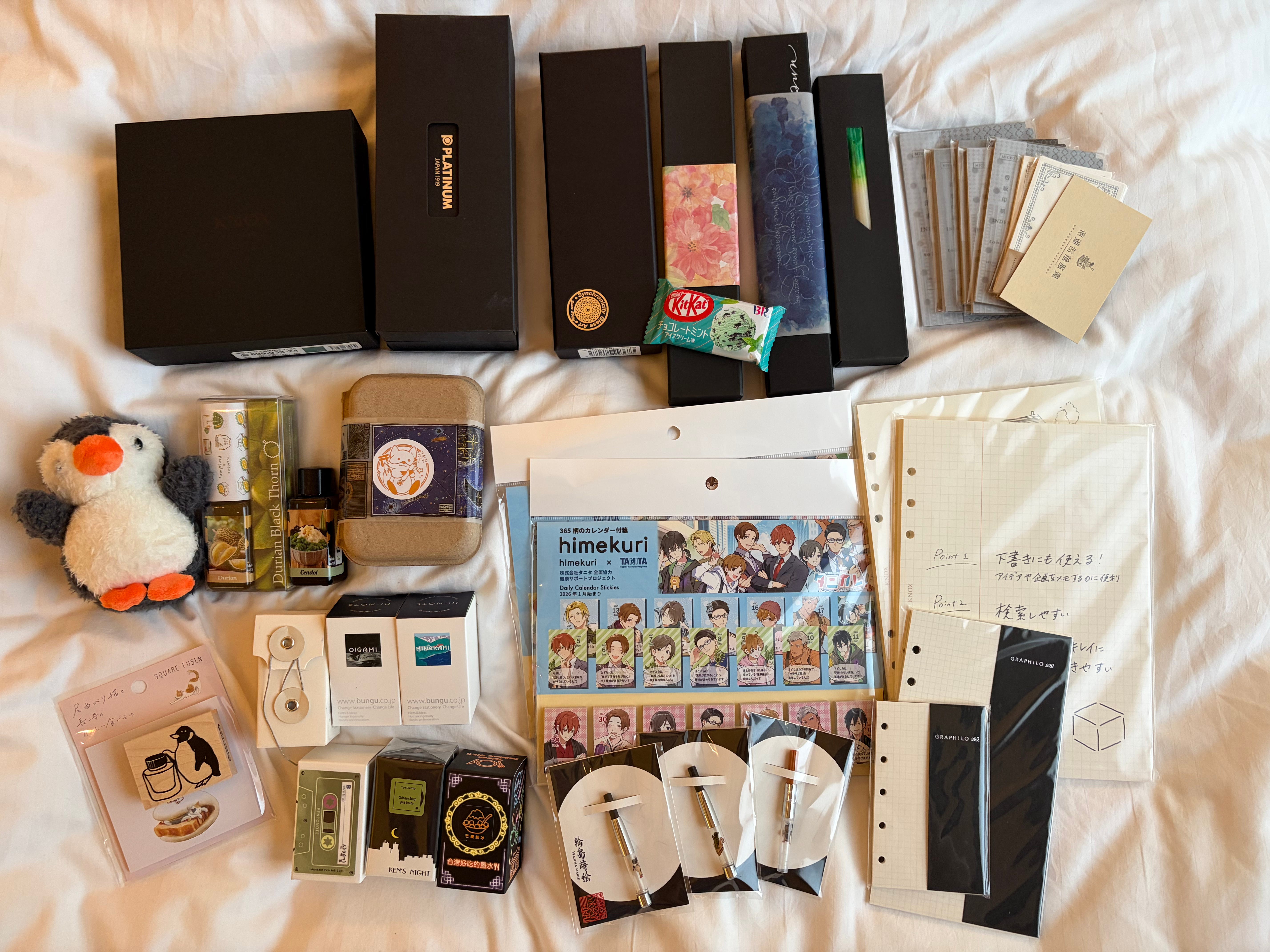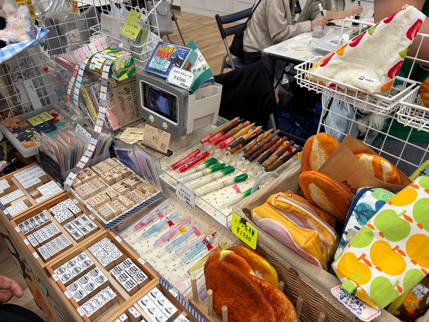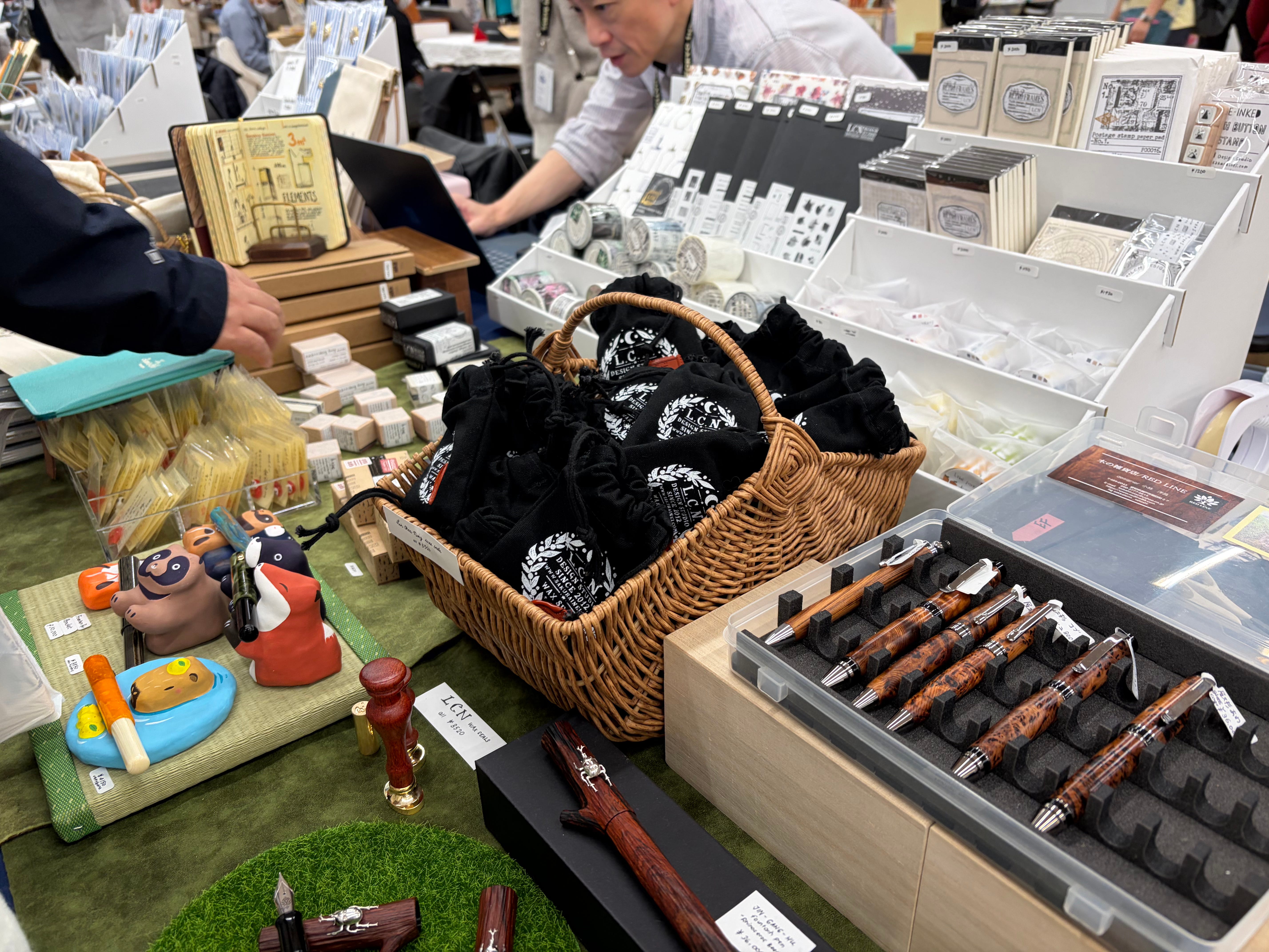 Although the event advertises itself as a “pen” show, Japan being Japan, the show is dotted with a variety of stationery goods, not limited to writing instruments. I consider myself to be a connoisseur of stationery in its widest spectrum — stickers, planners, stamps, inks, paper, and tabletop accessories; these are all fair game at a stationery-filled show such as TIPS. I’m not on the hunt for vintage or high-end fountain pens. Instead, I’m beelining for unique aesthetics and special store exclusives. My haul ranged from mint-chocolate themed glass pens to inks named after hot springs around Japan. I even picked up a cheap glass pen with a plastic body shaped like a leek.