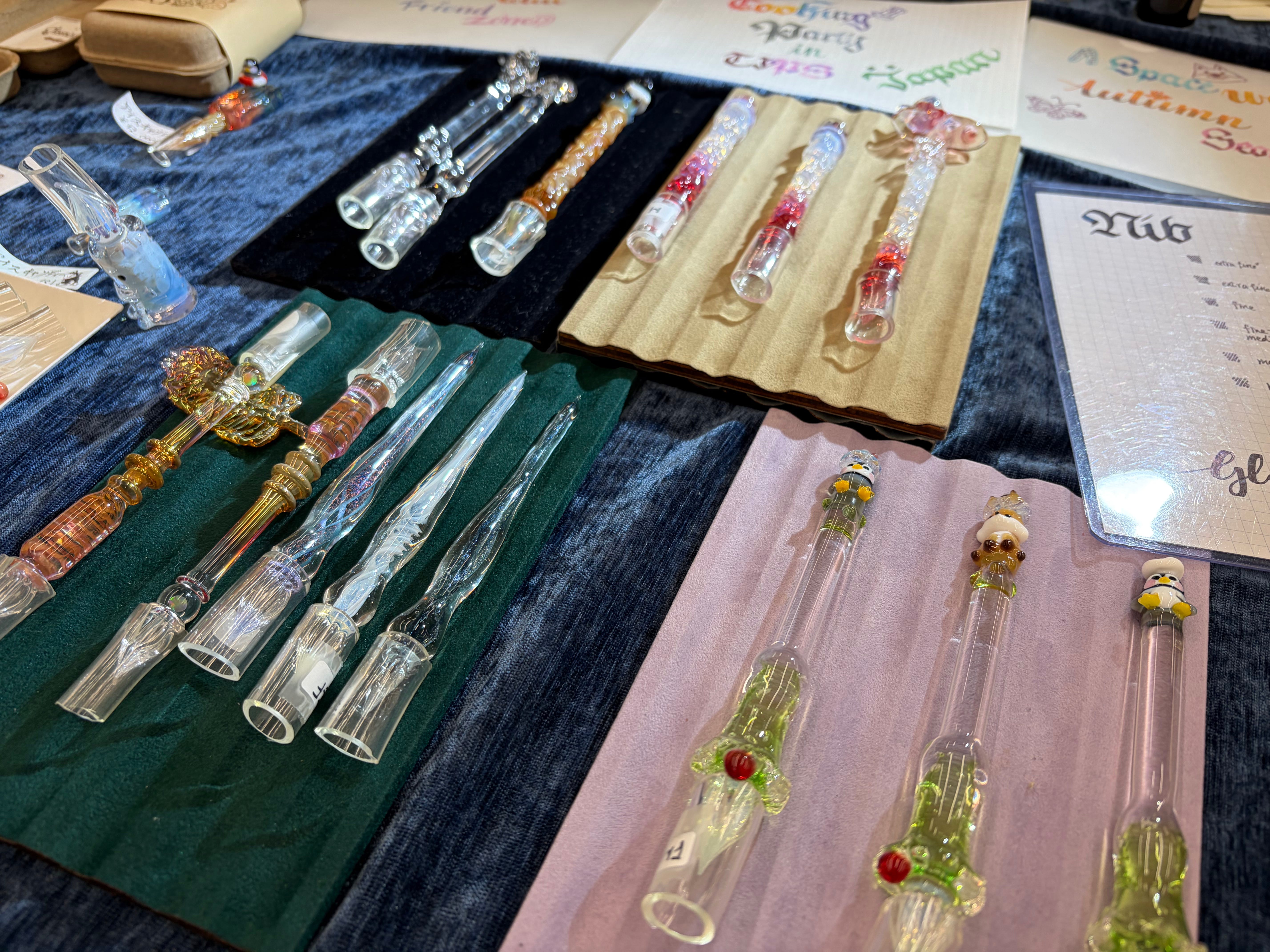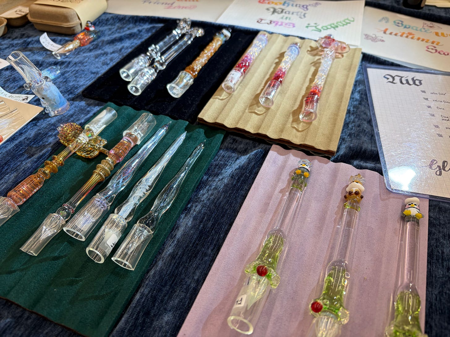 I was surprised to meet a few people who recognized me from The Stationery Cafe Podcast (although I was masked the whole time). I brought stickers for this exact occasion so that I can do sticker swaps with new friends and old. This show caters to all kinds of stationery enthusiasts: fountain pen veterans looking to find special high-end pens, journal junkies who are looking for planners and journals, and glass pen enthusiasts chasing the next exquisite craftsmanship. There are also booths touting everything retro and nostalgic (Things N’ Thanks), and a whimsical stationery store called “Manabe Keiko’s Funny Stationery Shop” where I purchased the leek-shaped glass pen.