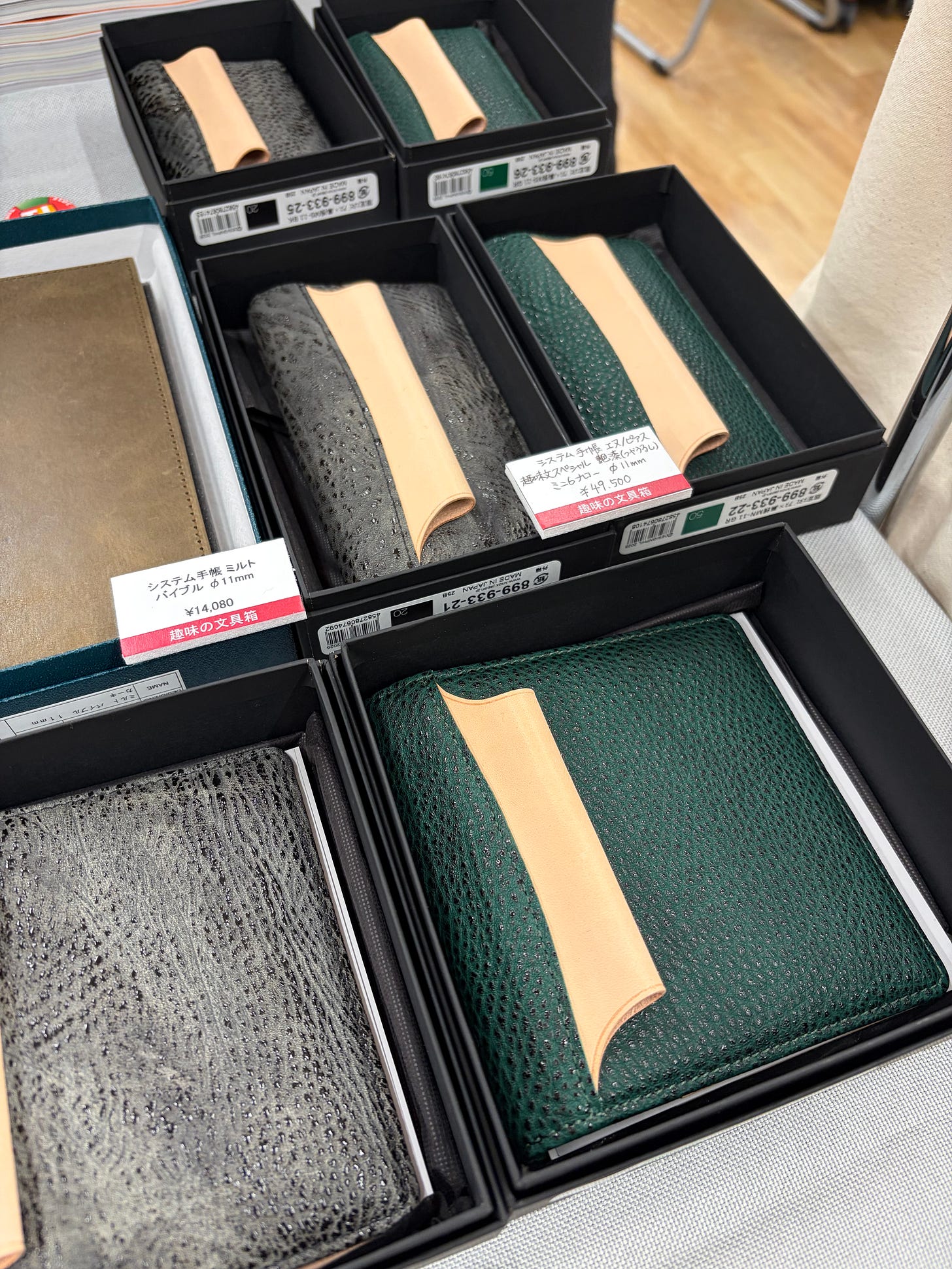 On the fifth floor, I wandered over to Shumibun (the media company that produces the quarterly stationery magazine: Stationery Hobby Box). They are also known to organize various stationery events in Japan, featuring product themes such as “System Techo Paradise” and other pen exclusives. Lo and behold, my eyes were drawn to a dark green but slightly glistening leather binder at the corner of the table. After asking if I could pick it up and examine the leather, I realized that this was a special KNOX exclusive that they made for Shumibun only!
