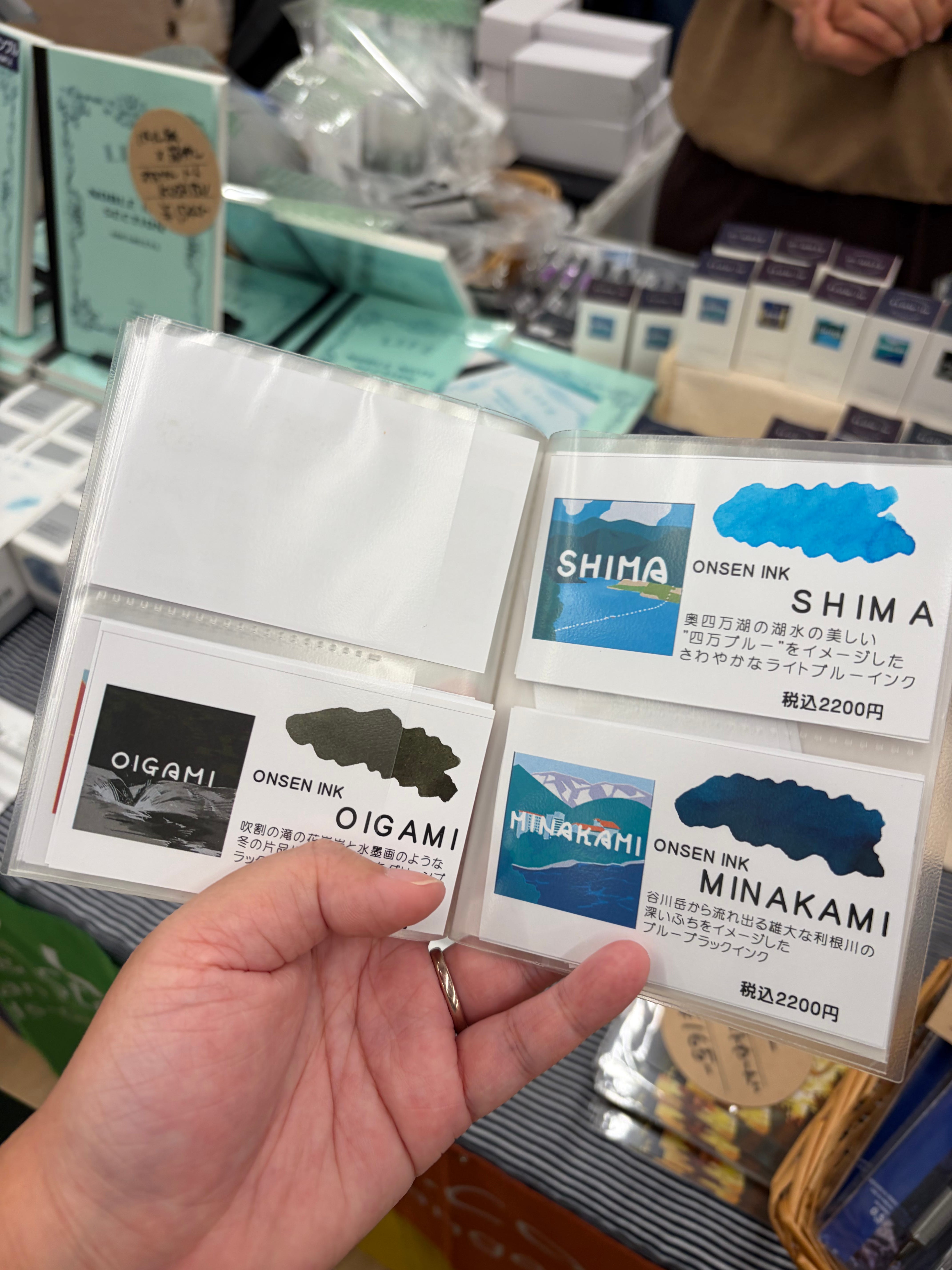 I’m a huge fan of hot springs and anything bath-related, and this beautiful pen immediately filled the Milky Way Pen-shaped hole in my heart (from the loss at Pentonote). There was a matching Noble Note in the same blue-green, but I applaud my self-control for not adding another notebook to my collection. This store also sells a unique collection of inks (made by Tono & Lims) inspired by hot springs from different areas of Gunma. I was impulsive and rational at the same time, and picked two practical colors (Oigami and Minakami) instead of buying the whole set as my heart desired.