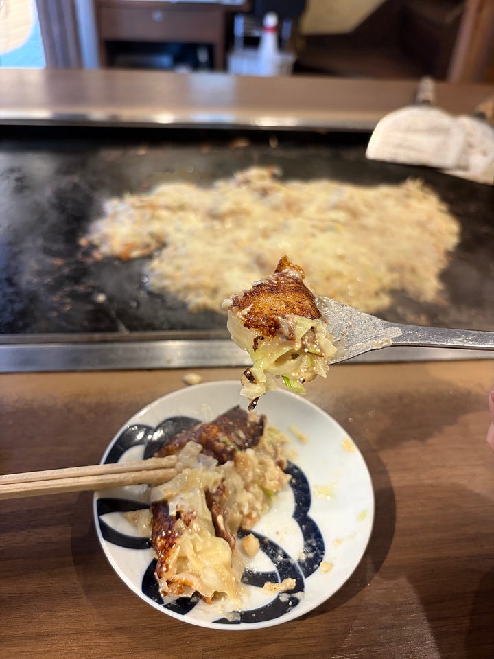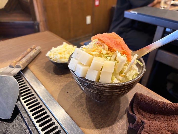 Monjayaki is the ugly cousin of the more well-known okonomiyaki. Instead of a solid pancake shape, the batter is more runny and gooey, forming a gloopy pile of deliciousness on the hot griddle for the uninitiated. Instead of eating it with a chopstick, you are handed a tiny griddle spatula that scoops up the concoction efficiently. I’m addicted to this stuff.