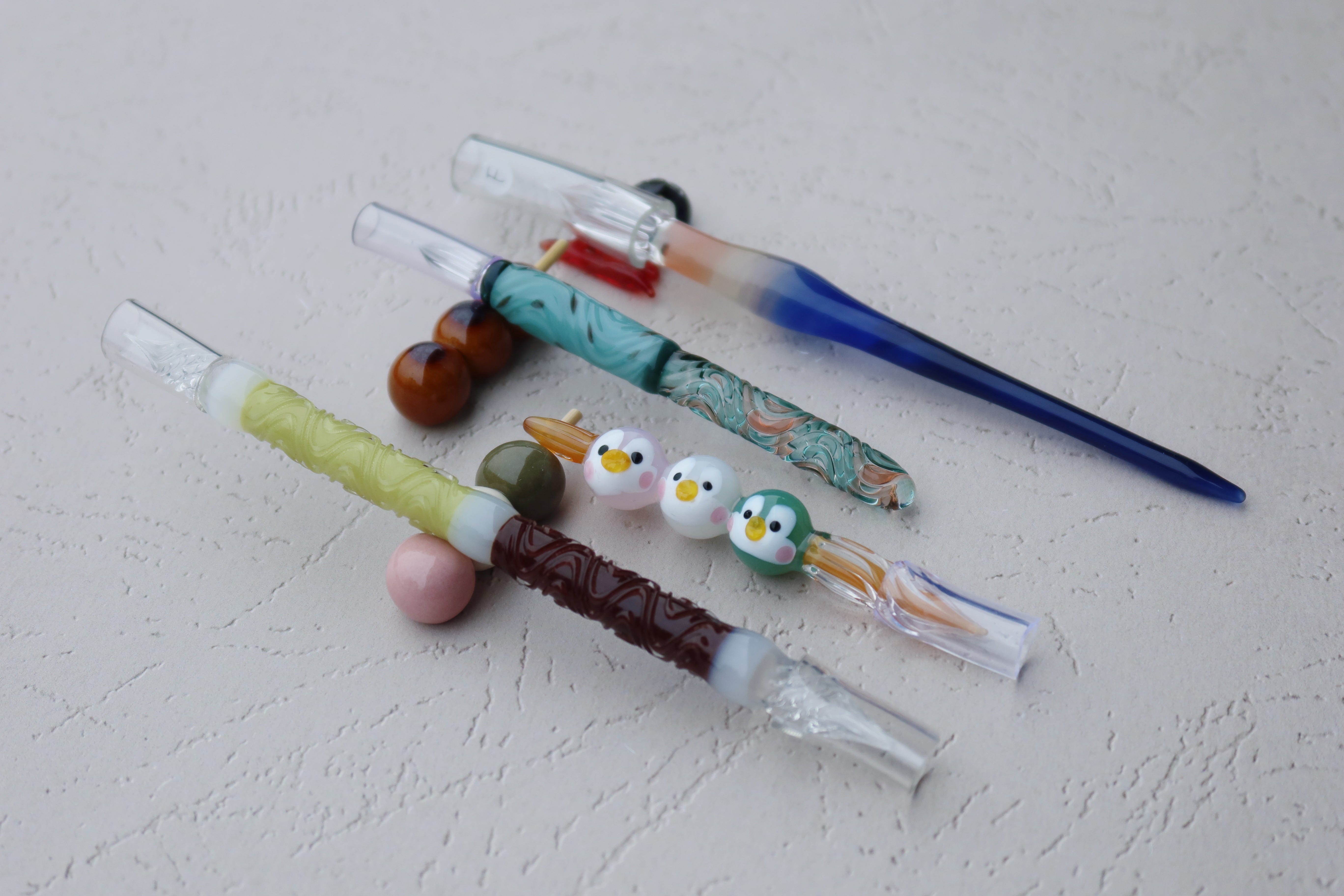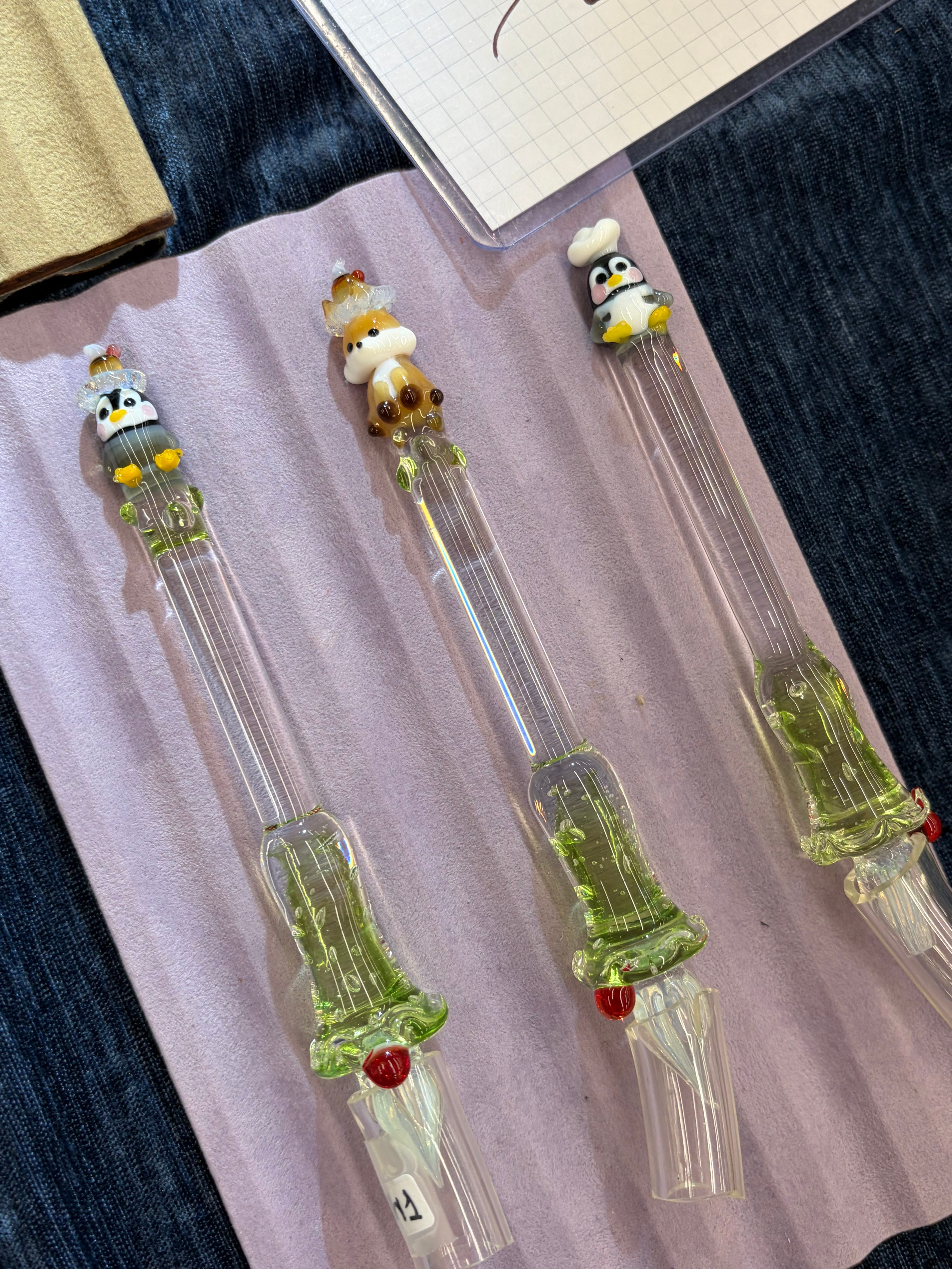 I saw June from Glassophy shared a series of stories on her Instagram promoting the glass pens and glass items she will be bringing to the show, on the day before TIPS. She made a beautiful collection of glass penguins, foxes, and various food motifs. I also saw them too late, as I was about to board a 10-hour flight with no internet. I desperately messaged June to ask if I could reserve the cutest sanshoku (tri-colored) dango, also shaped as penguin heads. It’s also a small pen rest with dual-sided glass pen tips (blunt for swatching and fude nib for calligraphy). I was this close to just sending money via PayPal to her account without even receiving a reply, just as a guarantee. When I land in Tokyo, the show would’ve already started, and it would’ve been too late. Thankfully, June remembered me from our previous encounters and graciously saved it for me.