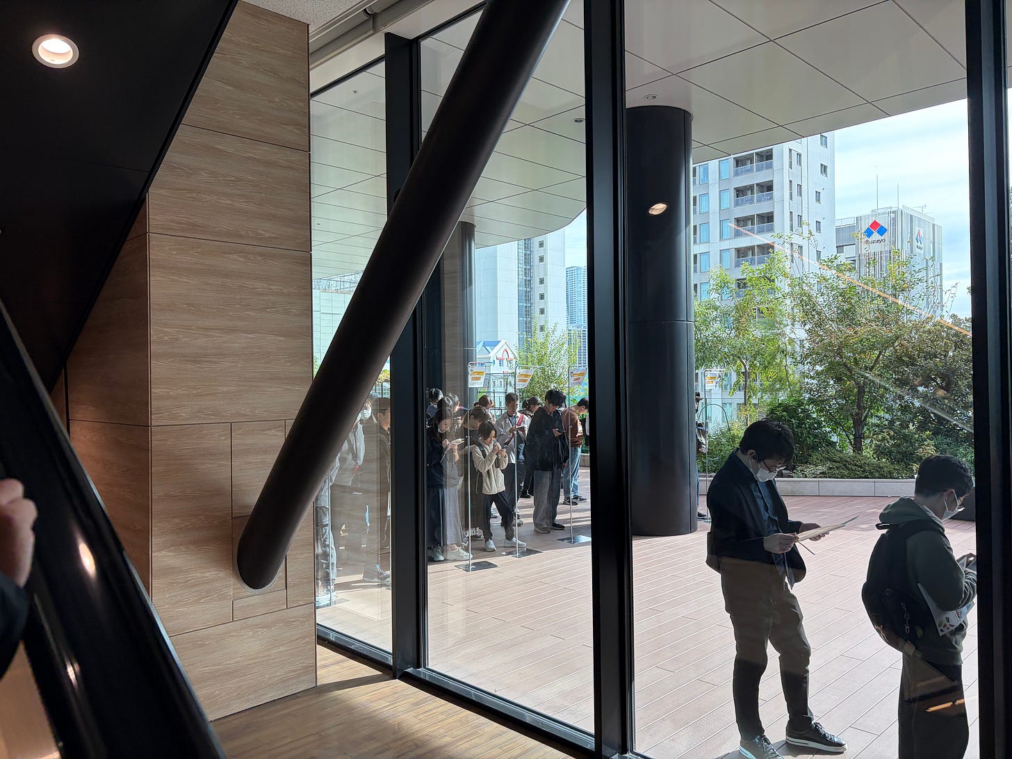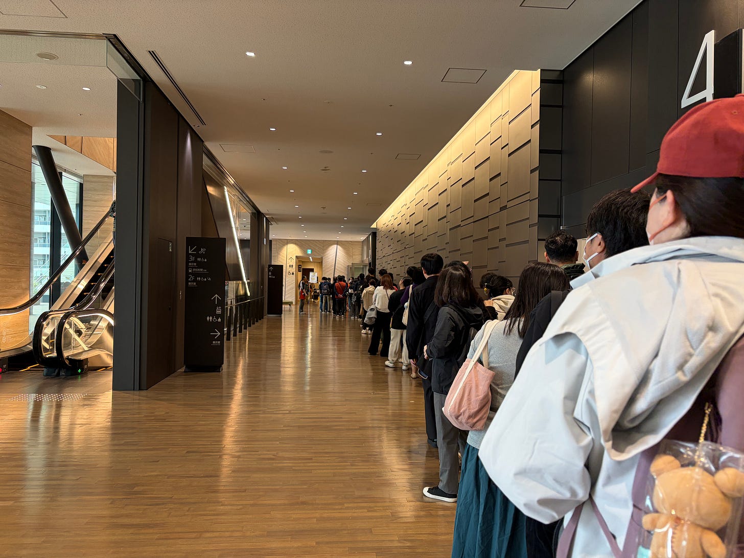 People going to the fifth floor are led up the escalator to our final queue (snaked so people stay in their order) to enter the hall on the fifth floor. On my way up the escalator to the fifth floor, I can see that the attendees for the second timed entry have already formed their organized array on the outer walkway, ready to fill our space once we all exit.
